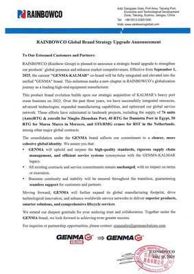 NANTONG, Trung Quốc, ngày 1 tháng 9 năm 2025 /PRNewswire/ – RAINBOWCO (SZ002483), công ty hàng đầu thế giới trong lĩnh vực sản xuất thiết bị cao cấp, thông báo rằng kể từ ngày 1 tháng 9 năm 2025, thiết bị container cảng được sản xuất tại cơ sở Taicang, Trung Quốc sẽ chuyển từ thương hiệu chung GENMA-KALMAR sang thương hiệu nhóm thống nhất “GENMA”. Động thái chiến lược này nhằm tăng cường ảnh hưởng thương hiệu toàn cầu của GENMA và đánh dấu một giai đoạn mới trong chiến lược mở rộng sản xuất thiết bị cao cấp toàn cầu của RAINBOWCO.