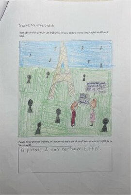 “Thật thú vị khi thấy các em vẽ chính mình đang sử dụng tiếng Anh trong những tình huống quen thuộc bên ngoài lớp học”, Tiến sĩ Séguis chia sẻ. Bà nói thêm: “Các em vẽ những tình huống trong xã hội như đi du lịch nước ngoài và nói chuyện với nhân viên lễ tân khách sạn, trò chuyện với bạn bè và gia đình, thậm chí dự đoán về nghề nghiệp tương lai. Chúng tôi còn thấy các em nhỏ vẽ cảnh những con vật đang trò chuyện bằng tiếng Anh, điều này cho thấy các em đang bắt đầu xây dựng bản sắc ngôn ngữ của riêng mình. Những bức tranh này thật tuyệt vời vì chúng hé lộ cách học sinh tiếp nhận giá trị của tiếng Anh và hiểu ngày càng rõ hơn vai trò của tiếng Anh như một công cụ giao tiếp trong đời sống thực tế”.